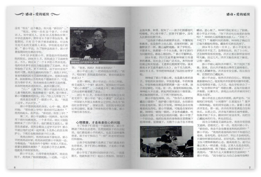 心理健康,才是他擔心的問題為了給孩子們營造一個溫暖的家,郭小平聘請了兩名生活老師,負貴照顧孩子的生活起居。他們都是郭小平的病人,也是艾滋病毒攜帶者。孩子對于和自己“一樣”的老師更加信任和接納。讓孩子吃飽穿暖只是滿足了他們基本的生存需求。孩子們的心理健康,才是郭小平擔心的事。郭小平花了很多時間陪伴孩子們,一到星期天,他就和孩子們一起出小黑板報,陪他們。