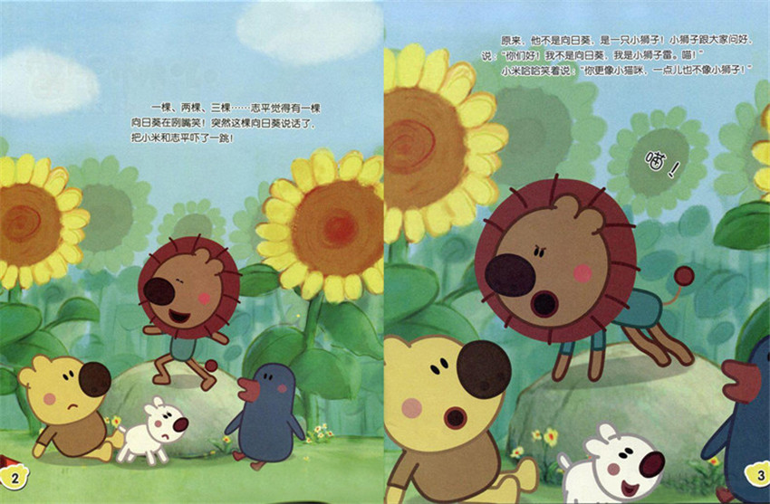 原來(lái),他不是向日葵,是一只小獅子!小獅子跟大家問(wèn)好,說(shuō):“你們好我不是向日葵,我是小獅子雷。喵!”小米哈哈笑著說(shuō):“你更像小貓咪,一一點(diǎn)兒也不像小獅子!一棵、兩棵、三棵.志平覺(jué)得有一棵向日葵在咧嘴笑!突然這棵向日葵說(shuō)話了,把小米和志平嚇了一-跳!